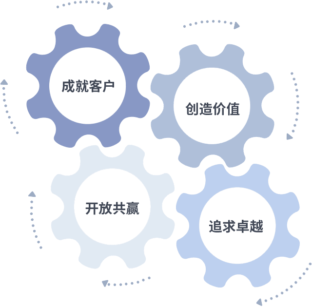 成就客户是一切决策的出发点,,,创造价值是衡量所有工作的标准,,,,追求卓越是我们做事做人的态度,,,,开放共赢是我们的格局也是最终的结果。。价值观的齿轮环环相扣,,推动着组织里的每个人不断向前。。。