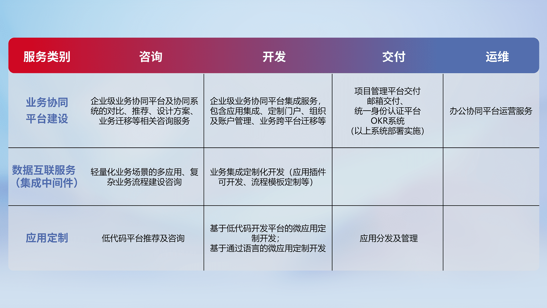 针对钉钉、、企微、、、IDaas等平台级产品提供产品的规划、、、方案、、、、交付、、定制化开发等服务,,,,实现如统一协同办公、、、、智能客户服务、、、混合会议管理、、、、智能数据查询、、、等业务场景,,实现数字化转型。。。。